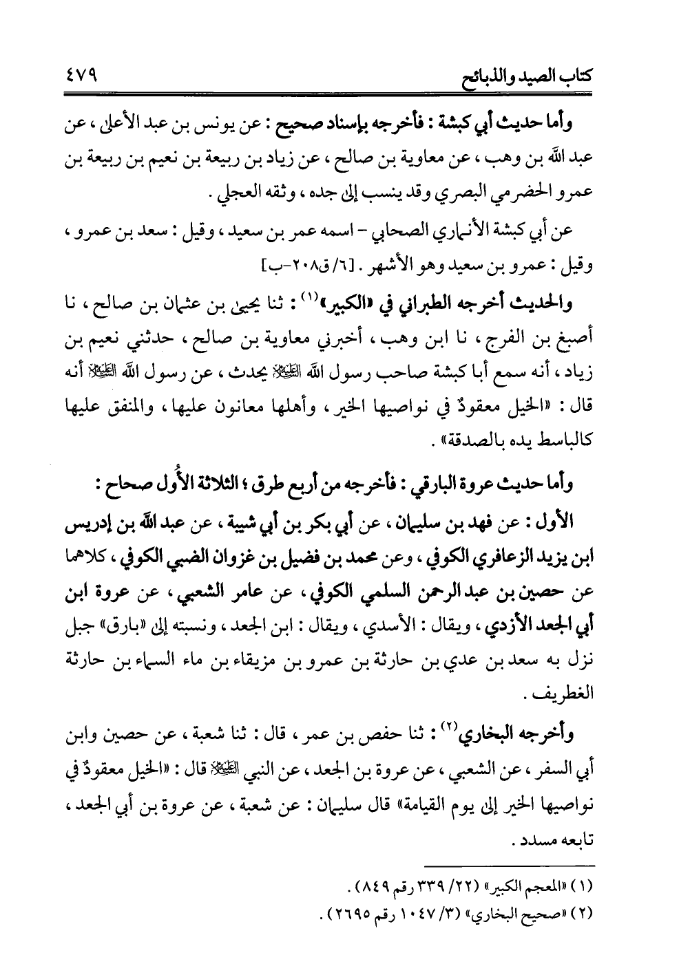 والحديث أخرجه الطبراني في "الكبير" (¬1): ثنا يحيى بن عثمان بن صالح، نا أصبغ بن الفرج، نا ابن وهب، أخبرني معاوية بن صالح، حدثني نعيم بن زياد، أنه سمع أبا كبشة صاحب رسول الله -عليه السلام- يحدث، عن رسول الله -عليه السلام- أنه قال: "الخيل معقودٌ في نواصيها الخير، وأهلها معانون عليها، والمنفق عليها كالباسط يده بالصدقة".