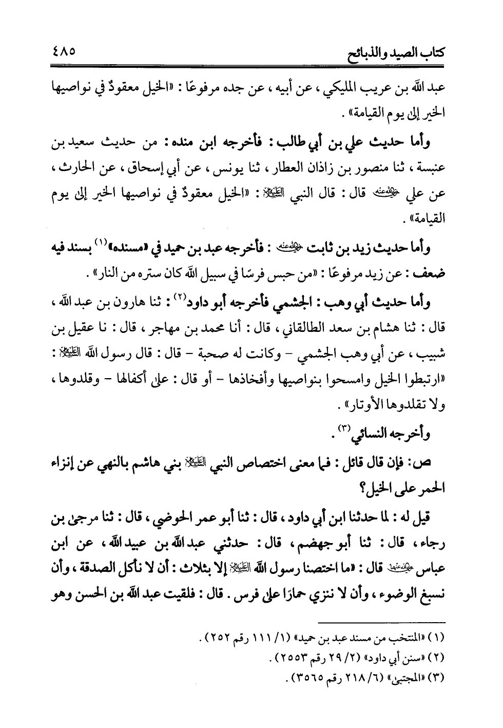 وأما حديث علي بن أبي طالب: فأخرجه ابن منده: من حديث سعيد بن عنبسة، ثنا منصور بن زاذان العطار، ثنا يونس، عن أبي إسحاق، عن الحارث، عن علي -رضي الله عنه- قال: قال النبي -عليه السلام-: "الخيل معقودٌ في نواصيها الخير إلى يوم القيامة".