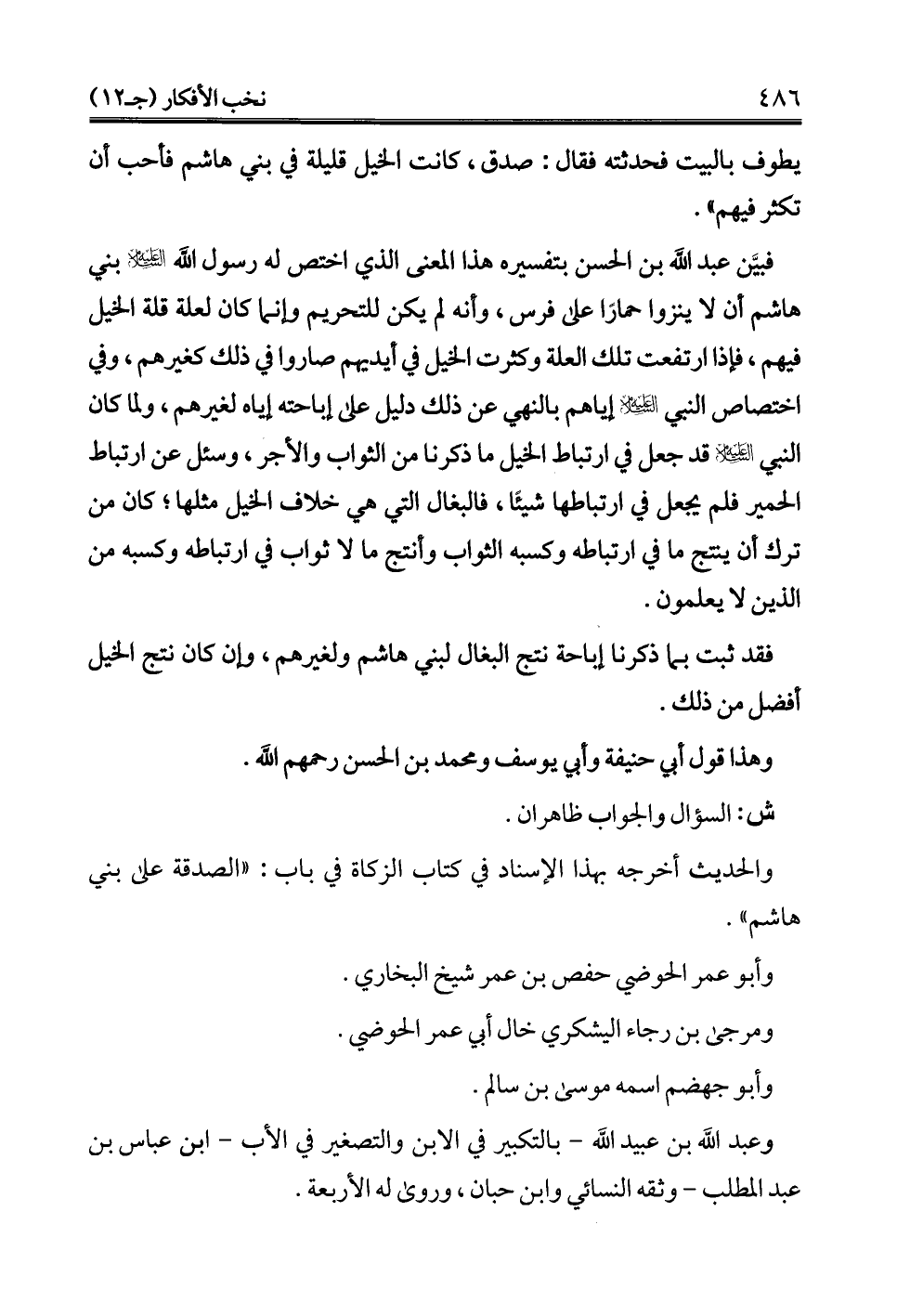 فبيَّن عبد الله بن الحسن بتفسيره هذا المعنى الذي اختص له رسول الله -عليه السلام- بني هاشم أن لا ينزوا حمارًا على فرس، وأنه لم يكن للتحريم وإنما كان لعلة قلة الخيل فيهم، فإذا ارتفعت تلك العلة وكثرت الخيل في أيديهم صاروا في ذلك كغيرهم، وفي اختصاص النبي -عليه السلام- إياهم بالنهي عن ذلك دليل على إباحته إياه لغيرهم، ولما كان النبي -عليه السلام- قد جعل في ارتباط الخيل ما ذكرنا من الثواب والأجر، وسئل عن ارتباط الحمير فلم يجعل في ارتباطها شيئًا، فالبغال التي هي خلاف الخيل مثلها؛ كان من ترك أن ينتج ما في ارتباطه وكسبه الثواب وكنتج ما لا ثواب في ارتباطه وكسبه من الذين لا يعلمون.