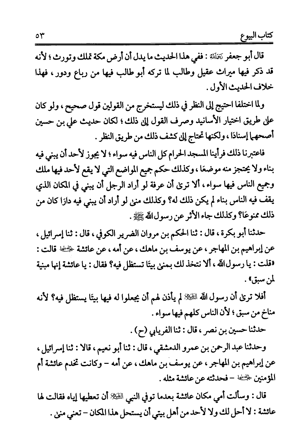 قال أبو جعفر -رحمه الله-: ففي هذا الحديث ما يدل أن أرض مكة تملك وتورث؛ لأنه قد ذكر فيها ميراث عقيل وطالب لما تركه أبو طالب فيها من رباع ودور، فهذا خلاف الحديث الأول.