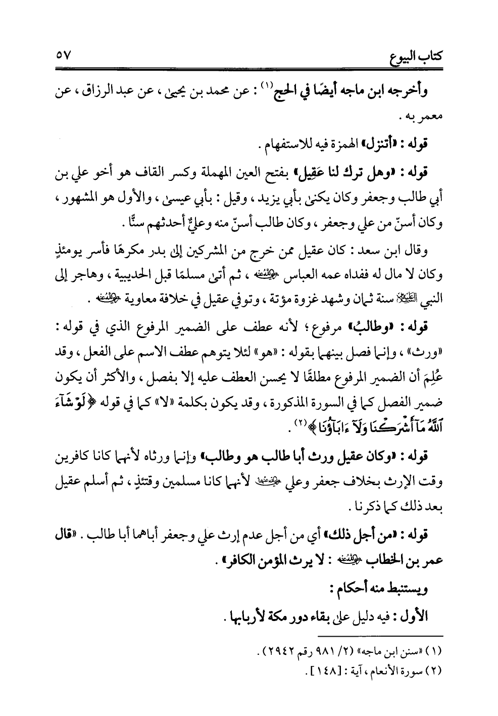 قوله: "وكان عقيل ورث أبا طالب هو وطالب" وإنما ورثاه لأنهما كانا كافرين وقت الإرث بخلاف جعفر وعلي -رضي الله عنهما- لأنهما كانا مسلمين وقتئذٍ، ثم أسلم عقيل بعد ذلك كما ذكرنا.