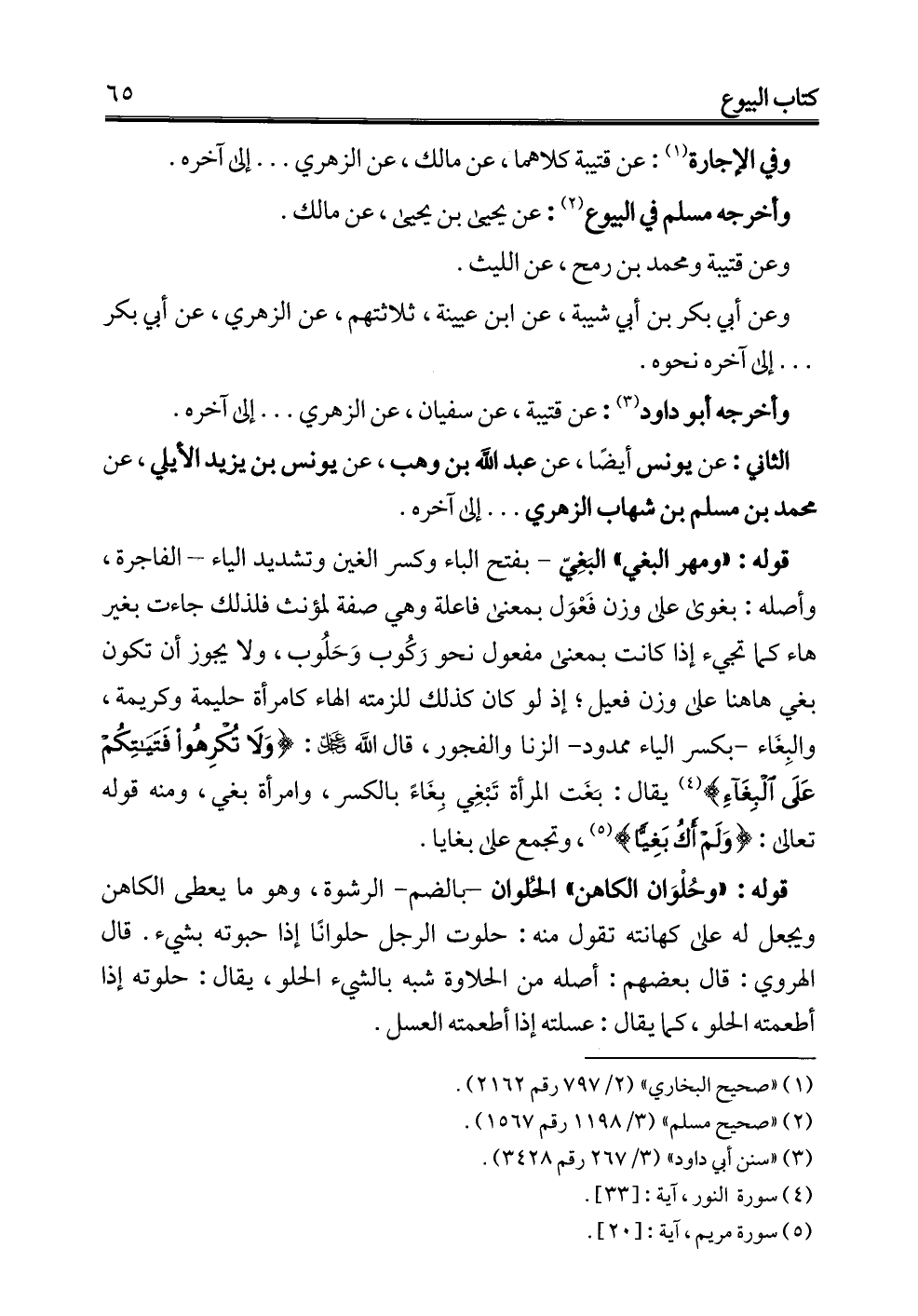 قوله: "ومهر البغي" البَغِيّ -بفتح الباء وكسر الغين وتشديد الياء- الفاجرة، وأصله: بغوى على وزن فَعْوَل بمعنى فاعلة وهي صفة لمؤنث فلذلك جاءت بغير هاء كما تجيء إذا كانت بمعنى مفعول نحو رَكُوب وَحَلُوب، ولا يجوز أن تكون بغي ها هنا على وزن فعيل؛ إذ لو كان كذلك للزمته الهاء كامرأة حليمة وكريمة، والبِغَاء -بكسر الياء ممدود- الزنا والفجور، قال الله -عز وجل-: {وَلَا تُكْرِهُوا فَتَيَاتِكُمْ عَلَى الْبِغَاءِ} (¬4) يقال: بَغَت المرأة تَبْغِي بِغَاءً بالكسر، وامرأة بغي، ومنه قوله تعالى: {وَلَمْ أَكُ بَغِيًّا} (¬5)، وتجمع على بغايا.