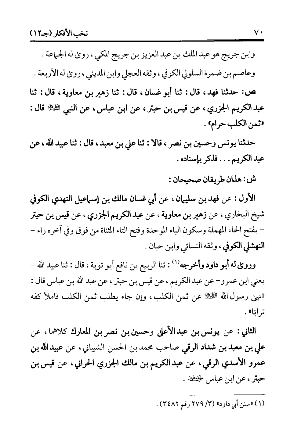 الأول: عن فهد بن سليمان، عن أبي غسان مالك بن إسماعيل النهدي الكوفي شيخ البخاري، عن زهير بن معاوية، عن عبد الكريم الجزري، عن قيس بن حبتر -بفتح الحاء المهملة وسكون الباء الموحدة وفتح التاء المثناة من فوق وفي آخره راء- النهشلي الكوفي، وثقه النسائي وابن حبان.