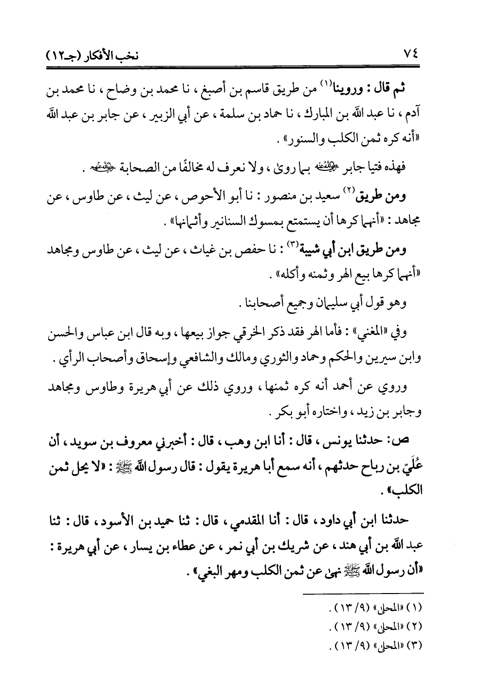 ثم قال: وروينا (¬1) من طريق قاسم بن أصبغ، نا محمد بن وضاح، نا محمد بن آدم، نا عبد الله بن المبارك، نا حماد بن سلمة، عن أبي الزبير، عن جابر بن عبد الله "أنه كره ثمن الكلب والسنور".