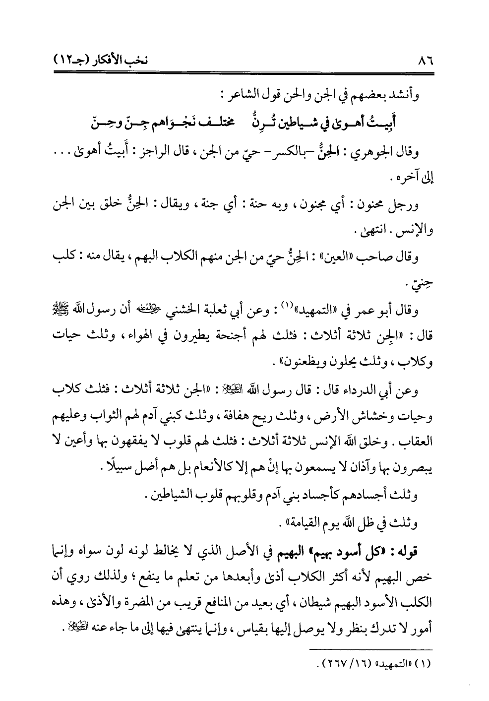 وقال أبو عمر في "التمهيد" (¬1): وعن أبي ثعلبة الخشني -رضي الله عنه- أن رسول الله - صلى الله عليه وسلم - قال: "الِجن ثلاثة أثلاث: فثلث لهم أجنحة يطيرون في الهواء، وثلث حيات وكلاب، وثلث يحلون ويظعنون".