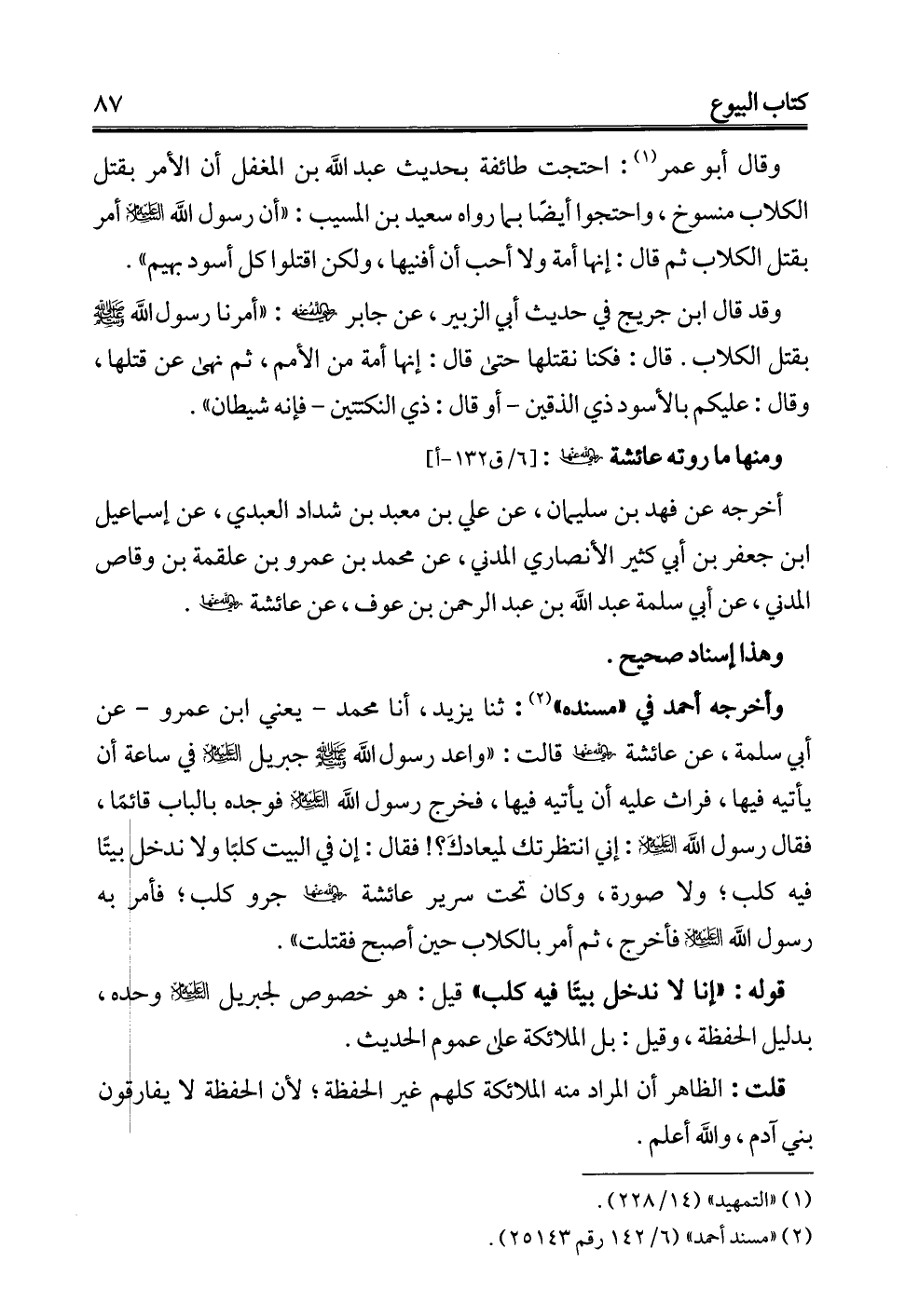 وأخرجه أحمد في "مسنده" (¬2): ثنا يزيد، أنا محمد -يعني ابن عمرو- عن أبي سلمة، عن عائشة -رضي الله عنها- قالت: "واعد رسول الله - صلى الله عليه وسلم - جبريل -عليه السلام- في ساعة أن يأتيه فيها، فراث عليه أن يأتيه فيها، فخرج رسول الله -عليه السلام- فوجده بالباب قائمًا، فقال رسول الله -عليه السلام-: إني انتظرتك لميعادكَ؟! فقال: إن في البيت كلبًا ولا ندخل بيتًا فيه كلب؛ ولا صورة، وكان تحت سرير عائشة -رضي الله عنها- جرو كلب؛ فأمر به رسول الله -عليه السلام- فأخرج، ثم أمر بالكلاب حين أصبح فقتلت".