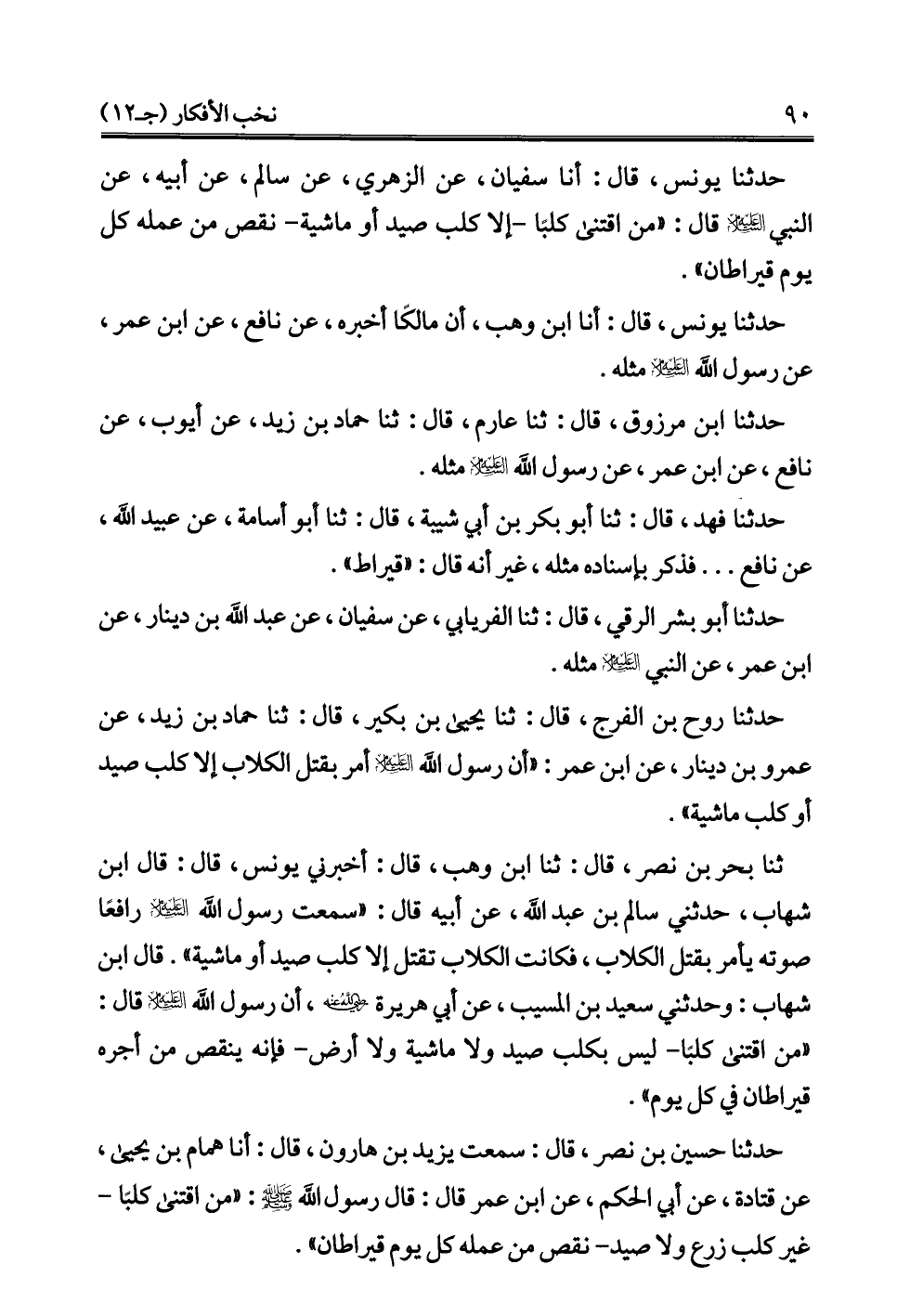 ثنا بحر بن نصر، قال: ثنا ابن وهب، قال: أخبرني يونس، قال: قال ابن شهاب، حدثني سالم بن عبد الله، عن أبيه قال: "سمعت رسول الله -عليه السلام- رافعًا صوته يأمر بقتل الكلاب، فكانت الكلاب تقتل إلا كلب صيد أو ماشية". قال ابن شهاب: وحدثني سعيد بن المسيب، عن أبي هريرة -رضي الله عنه-، أن رسول الله -عليه السلام- قال: "من اقتنى كلبًا -ليس بكلب صيد ولا ماشية ولا أرض- فإنه ينقص من أجره قيراطان في كل يوم".