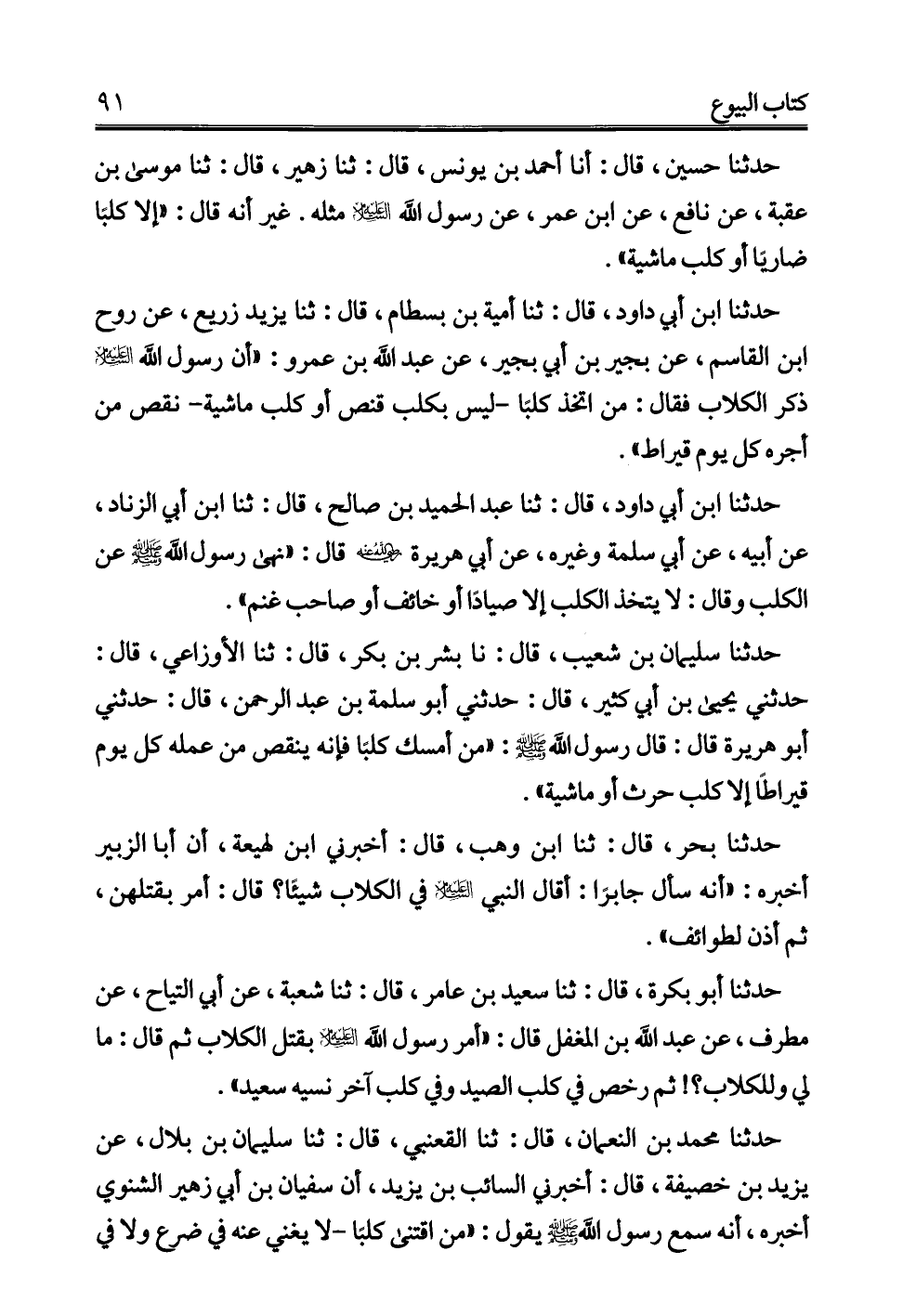 حدثنا ابن أبي داود، قال: ثنا أمية بن بسطام، قال: ثنا يزيد زريع، عن روح ابن القاسم، عن بجير بن أبي بجير، عن عبد الله بن عمرو: "أن رسول الله -عليه السلام- ذكر الكلاب فقال: من اتخذ كلبًا -ليس بكلب قنص أو كلب ماشية- نقص من أجره كل يوم قيراط".