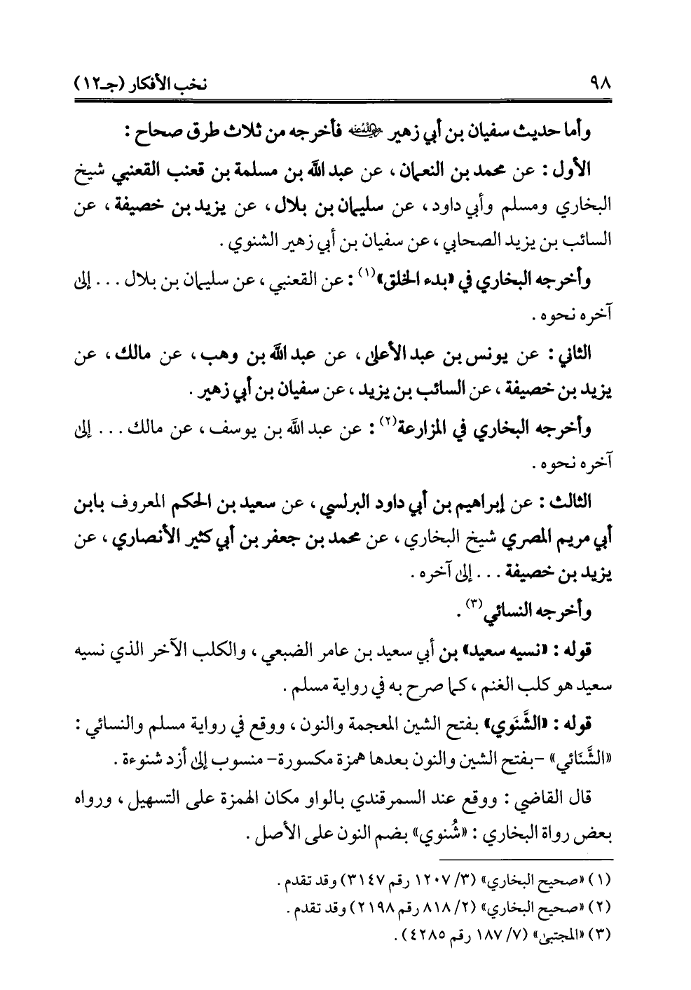 الأول: عن محمد بن النعمان، عن عبد الله بن مسلمة بن قعنب القعنبي شيخ البخاري ومسلم وأبي داود، عن سليمان بن بلال، عن يزيد بن خصيفة، عن السائب بن يزيد الصحابي، عن سفيان بن أبي زهير الشنوي.