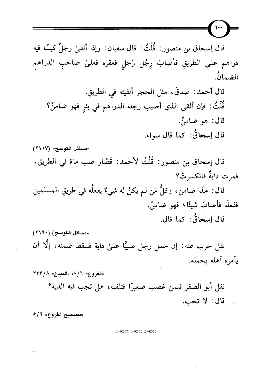 قال إسحاق بن منصور: قُلْتُ: قال سفيان: وإذا ألقى رجلٌ كيسًا فيه دراهم على الطريقِ فأصابَ رِجْل رَجلٍ فعقره فعلى صاحبِ الدراهمِ الضمانُ.