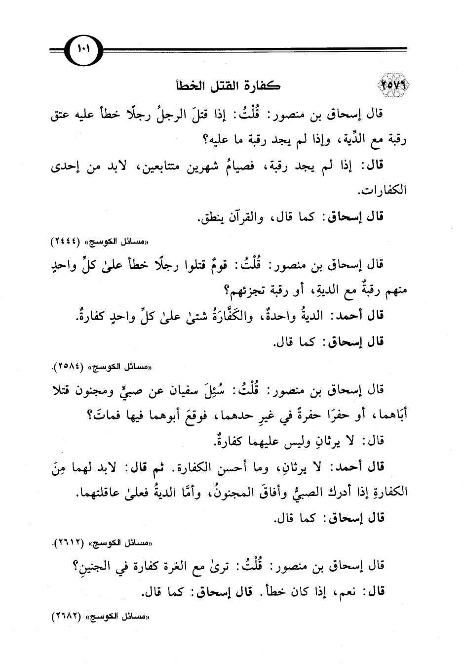 قال إسحاق بن منصور: قُلْتُ: قومٌ قتلوا رجلًا خطأ على كلِّ واحدٍ منهم رقبةٌ مع الديةِ، أو رقبة تجزئهم؟