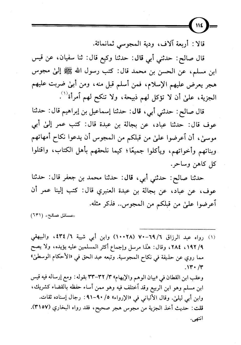 قال صالح: حدثني أبي، قال: حدثنا إسماعيل بن إبراهيم قال: حدثنا عوف قال: حدثنا عباد، عن بجالة بن عبدة قال: كتب عمر إلى أبي موسى، أن اعرضوا على من قبلكم من المجوس أن يدعوا نكاح أمهاتهم وبناتهم وأخواتهم، ويأكلوا جميعًا؛ كيما نلحقهم بأهل الكتاب، واقتلوا كل كاهن وساحر.