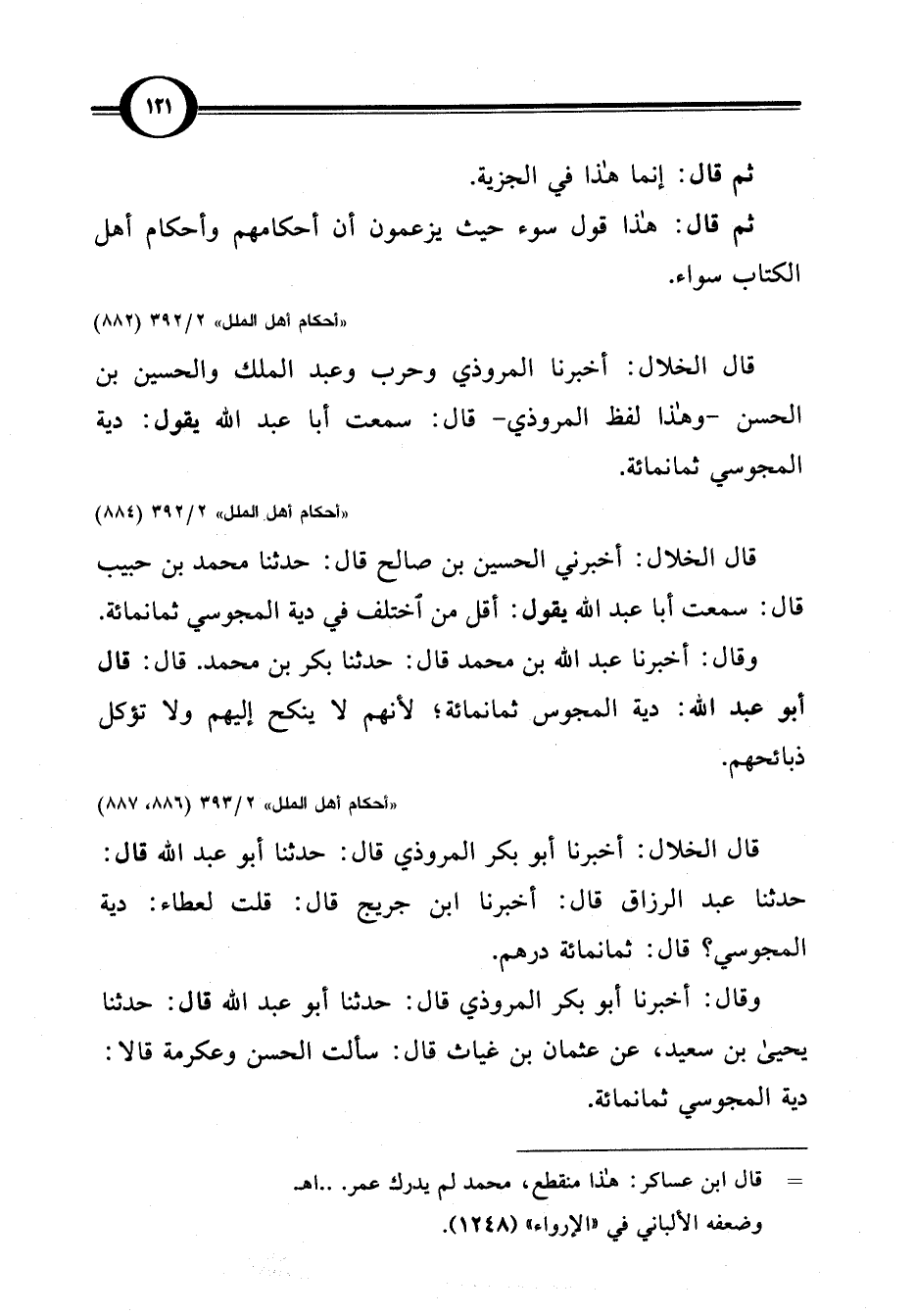 وقال: أخبرنا أبو بكر المروذي قال: حدثنا أبو عبد اللَّه قال: حدثنا يحيى بن سعيد، عن عثمان بن غياث قال: سألت الحسن وعكرمة قالا: دية المجوسي ثمانمانة.