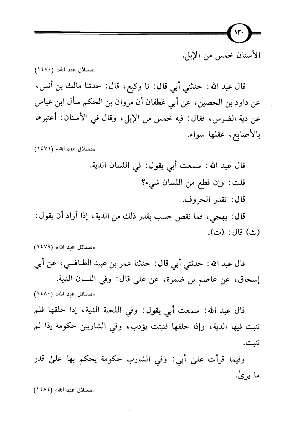 قال عبد اللَّه: حدثني أبي قال: حدثنا عمر بن عبيد الطنافسي، عن أبي إسحاق، عن عاصم بن ضمرة، عن علي قال: وفي اللسان الدية.