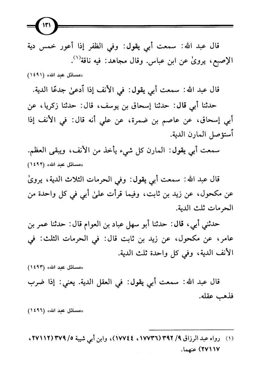 قال عبد اللَّه: سمعت أبي يقول: وفي الحرمات الثلاث الدية، يروى عن مكحول، عن زيد بن ثابت، وفيما قرأت على أبي في كل واحدة من الحرمات ثلث الدية.