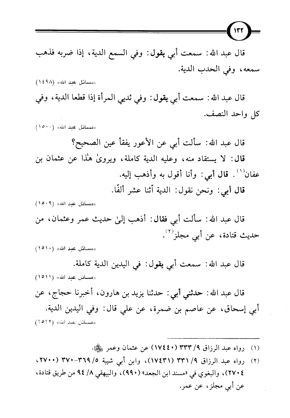 قال عبد اللَّه: سألت أبي فقال: أذهب إلى حديث عمر وعثمان، من حديث قتادة، عن أبي مجلز (¬2).