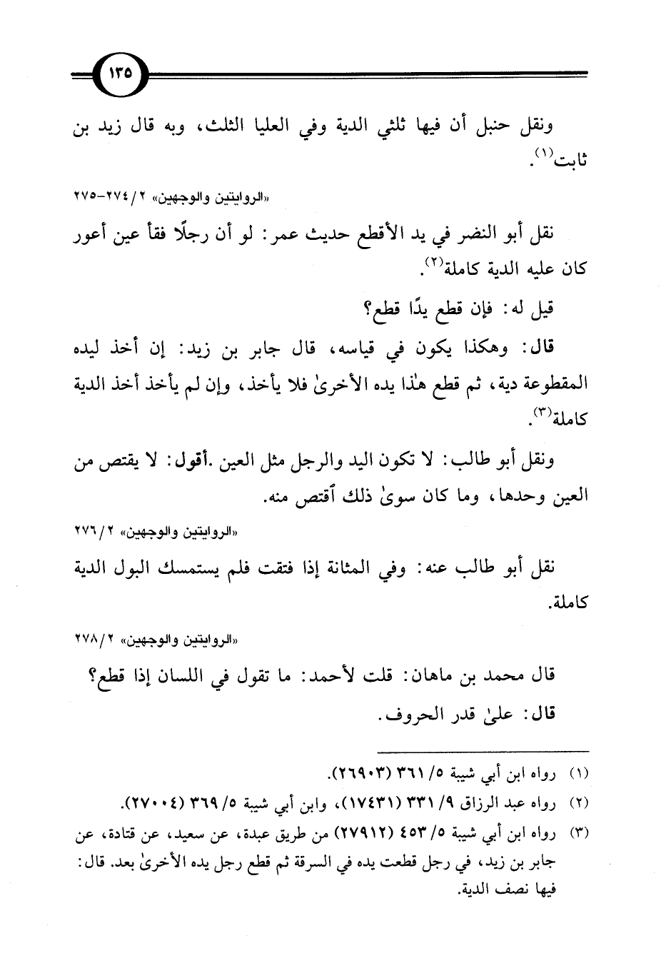 (¬3) رواه ابن أبي شيبة 5/ 453 (27912) من طريق عبدة، عن سعيد، عن قتادة، عن جابر بن زيد، في رجل قطعت يده في السرقة ثم قطع رجل يده الأخرى بعد. قال: فيها نصف الدية.