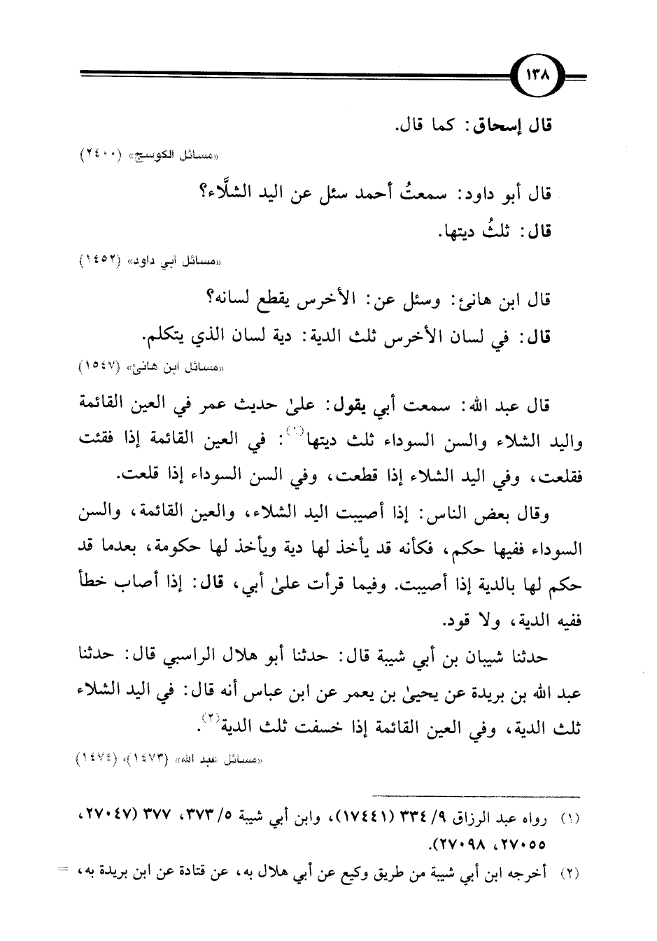 قال عبد اللَّه: سمعت أبي يقول: على حديث عمر في العين القائمة واليد الشلاء والسن السوداء ثلث ديتها (¬1): في العين القائمة إذا فقئت فقلعت، وفي اليد الشلاء إذا قطعت، وفي السن السوداء إذا قلعت.