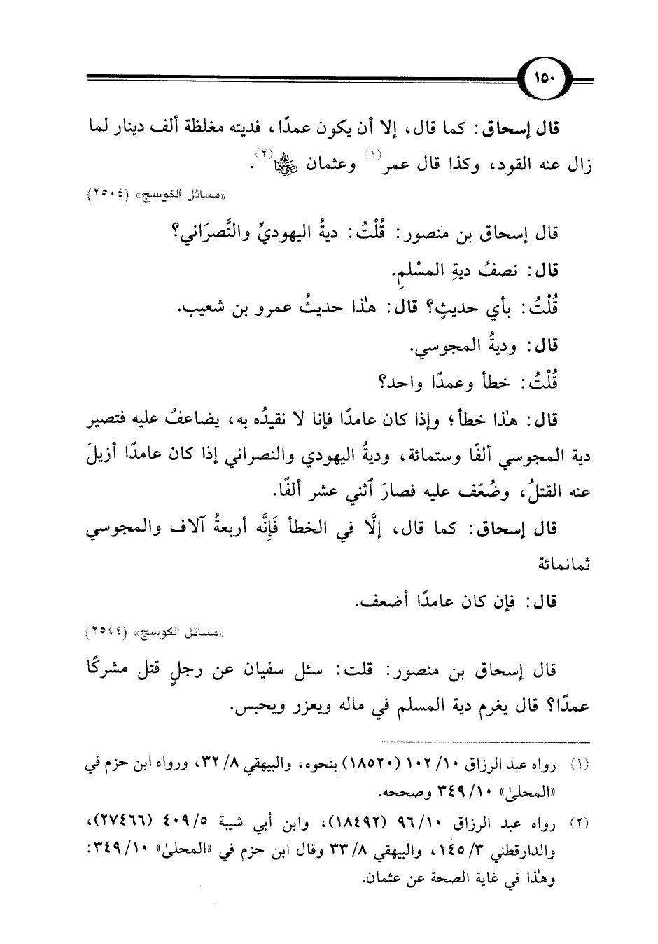 قال إسحاق بن منصورْ قُلْتُ: ديةُ اليهوديِّ والنَّصرَاني؟