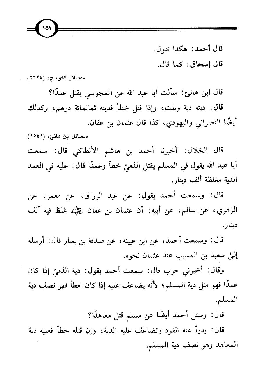 وقال: أخبرني حرب قال: سمعت أحمد يقول: دية الذميّ إذا كان عمدًا فهو مثل دية المسلم؛ لأنه يضاعف عليه إذا كان خطا فهو نصف دية المسلم.