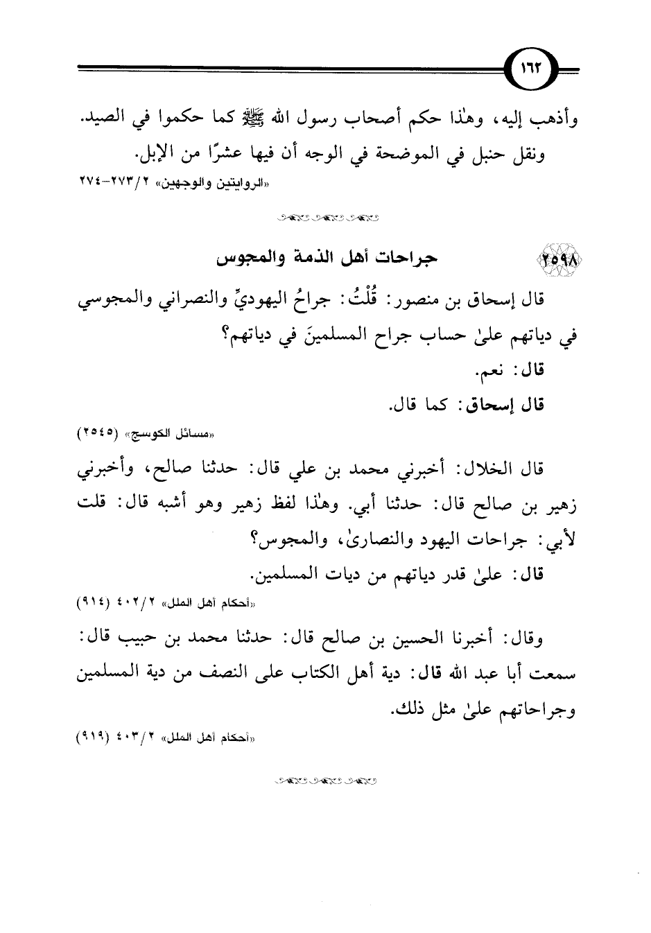 قال إسحاق بن منصور: قُلْتُ: جراحُ اليهوديَ والنصراني والمجوسي في دياتهم على حساب جراح المسلمينَ في دياتهم؟