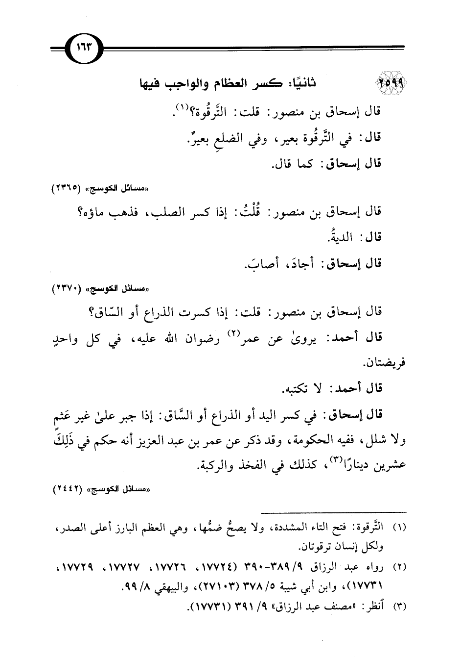 قال إسحاق بن منصور: قلت: إذا كسرت الذراع أو السّاق؟