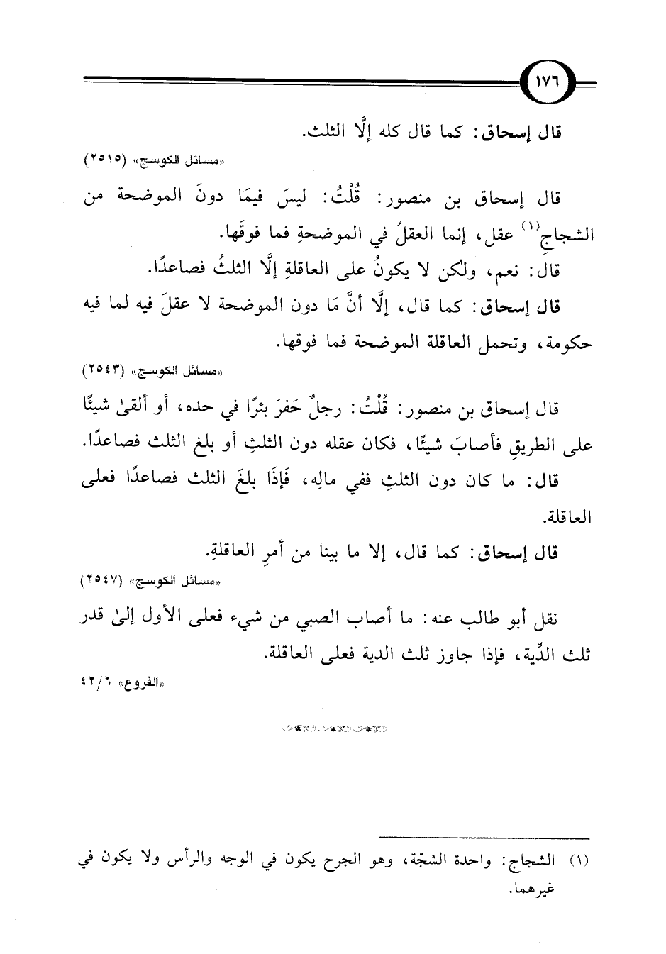 قال إسحاق بن منصور: قُلْتُ: ليسَ فيمَا دونَ الموضحة من الشجاجِ (¬1) عقل، إنما العقلُ في الموضحةِ فما فوقَها.