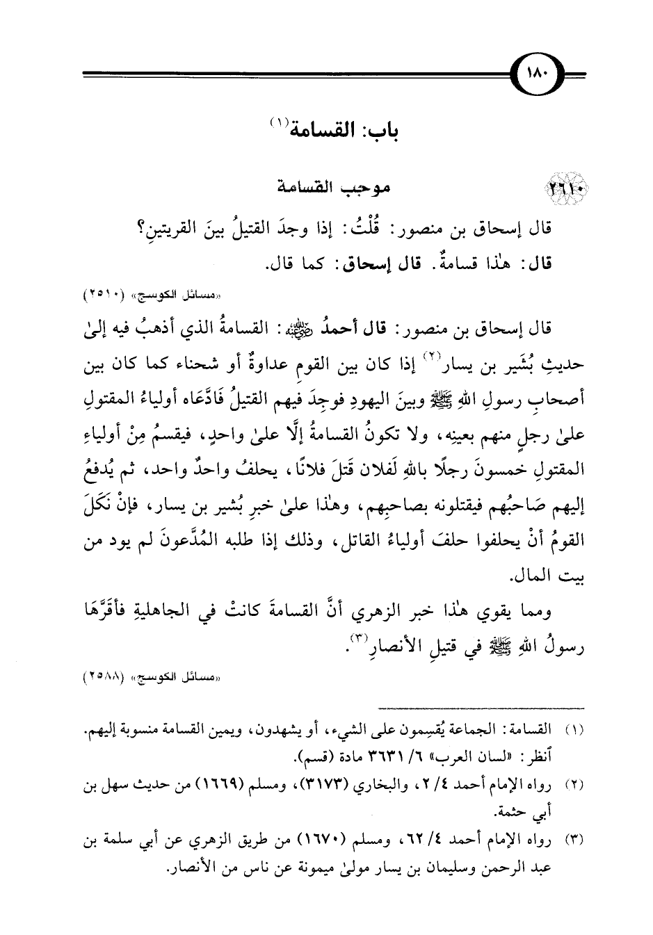 (¬1) القسامة: الجماعة يُقسِمون على الشيء، أو يشهدون، ويمين القسامة منسوبة إليهم. انظر: "لسان العرب" 6/ 3631 مادة (قسم).