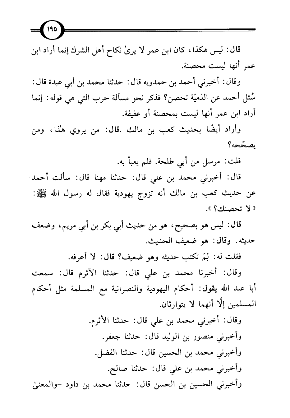 قال: أخبرني محمد بن علي قال: حدثنا مهنا قال: سألت أحمد عن حديث كعب بن مالك أنه تزوج يهودية فقال له رسول اللَّه -صلى اللَّه عليه وسلم-: "لا تحصنك؟ ".