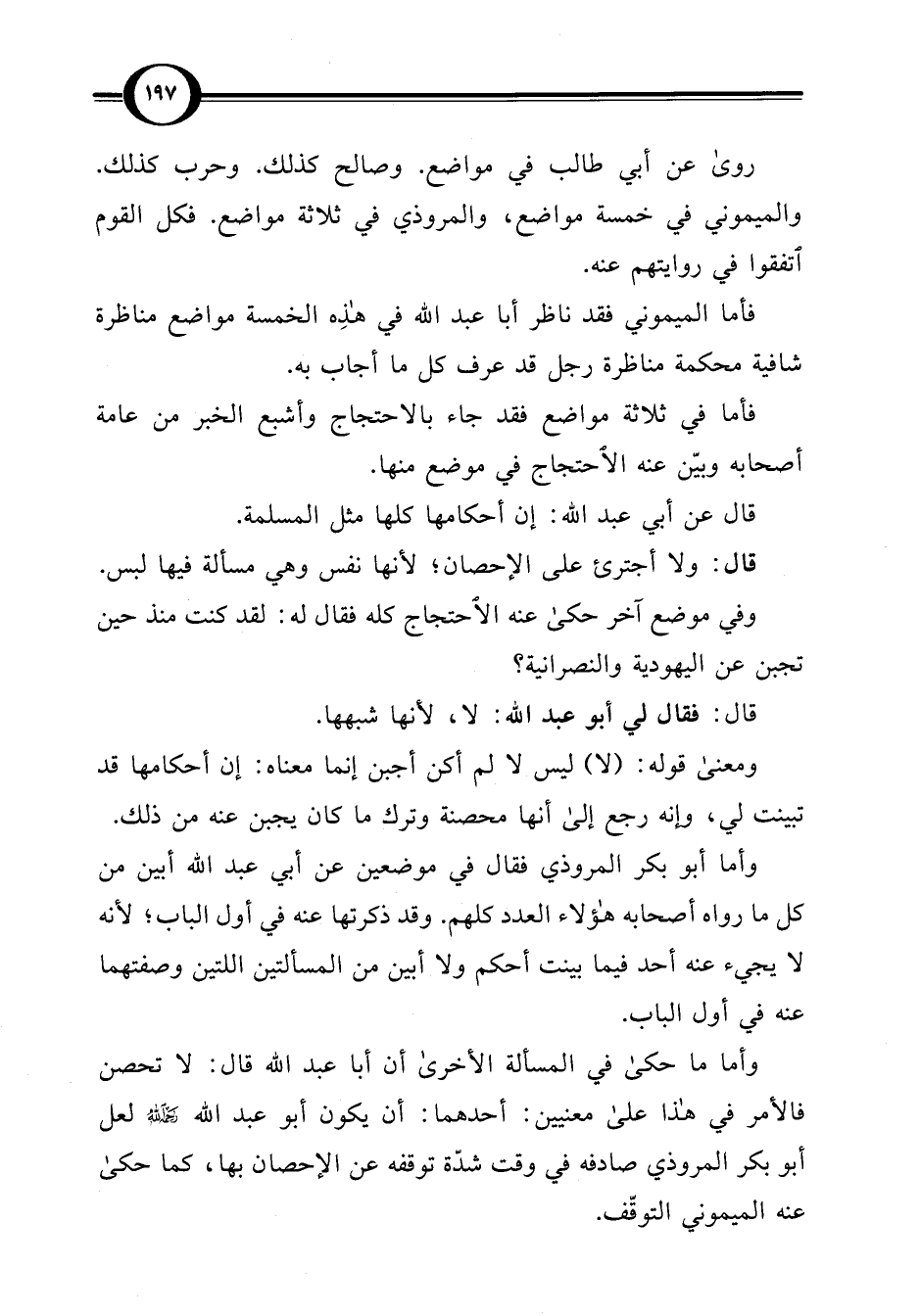 فأما الميموني فقد ناظر أبا عبد اللَّه في هذِه الخمسة مواضع مناظرة شافية محكمة مناظرة رجل قد عرف كل ما أجاب به.