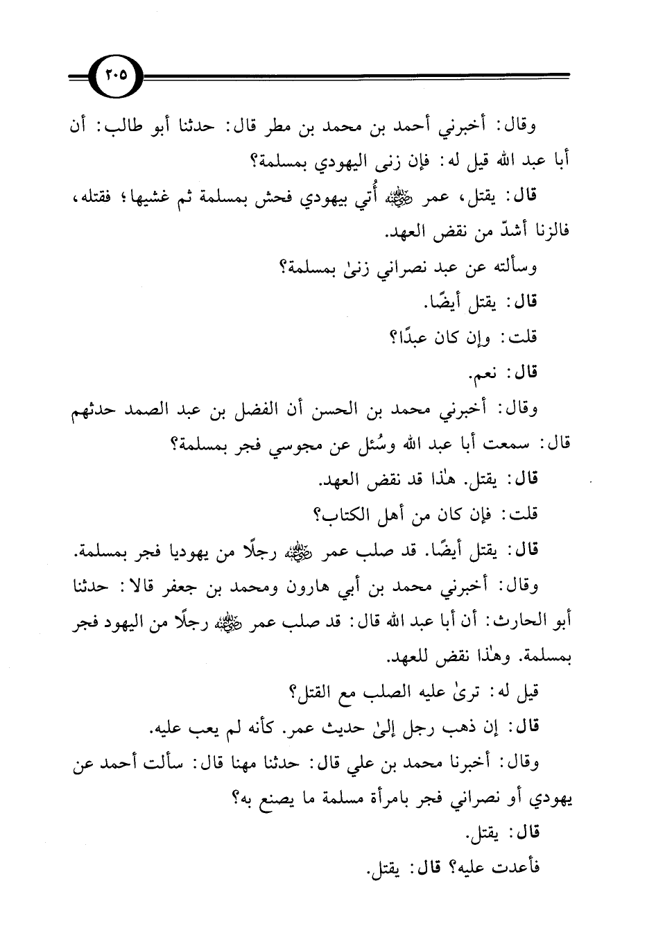 وقال: أخبرني محمد بن أبي هارون ومحمد بن جعفر قالا: حدثنا أبو الحارث: أن أبا عبد اللَّه قال: قد صلب عمر -رضي اللَّه عنه- رجلًا من اليهود فجر بمسلمة. وهذا نقض للعهد.