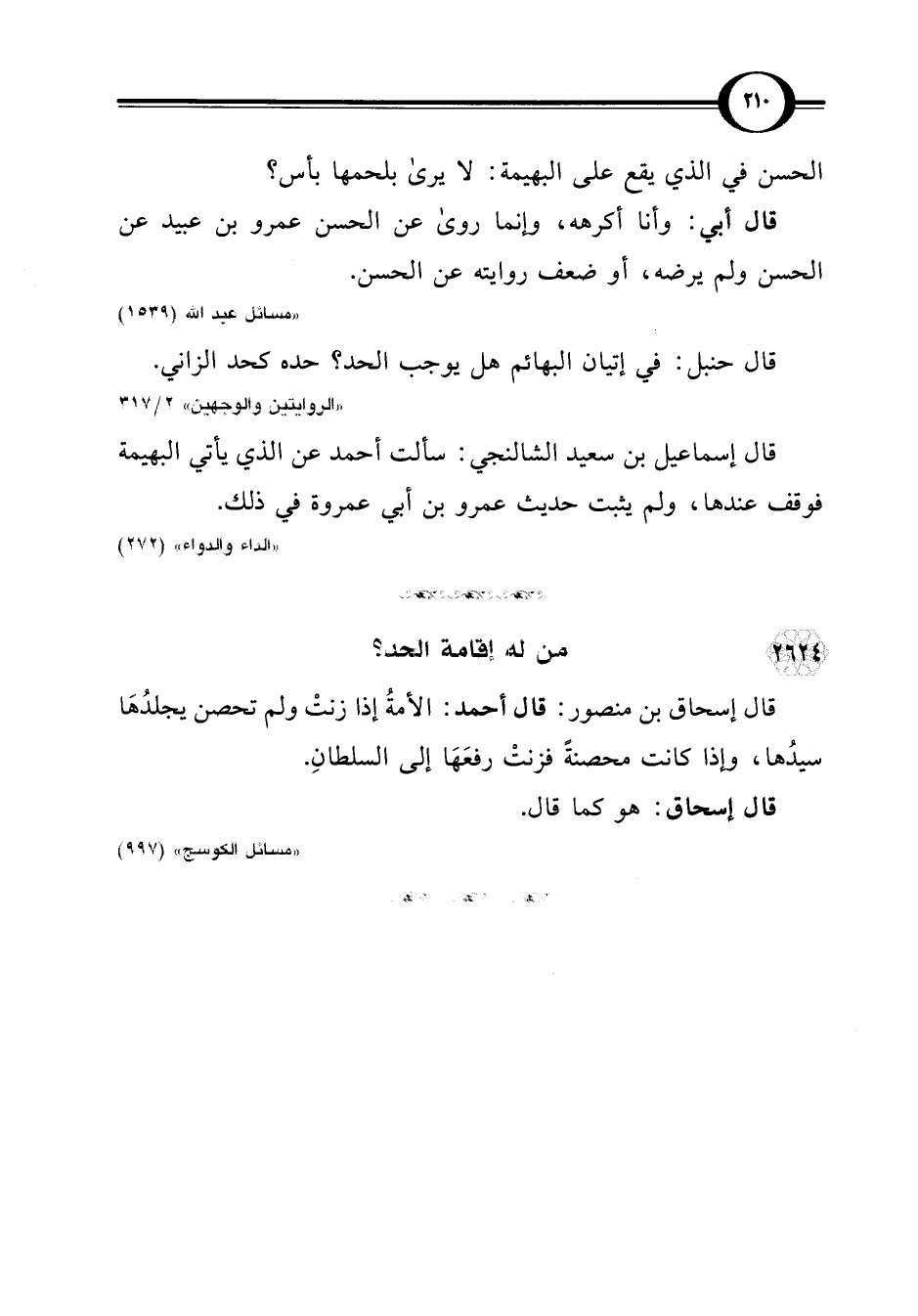 قال إسحاق بن منصور: قال أحمد: الأمةُ إذا زنتْ ولم تحصن يجلدُهَا سيدُها، وإذا كانت محصنةً فزنتْ رفعَهَا إلى السلطانِ.