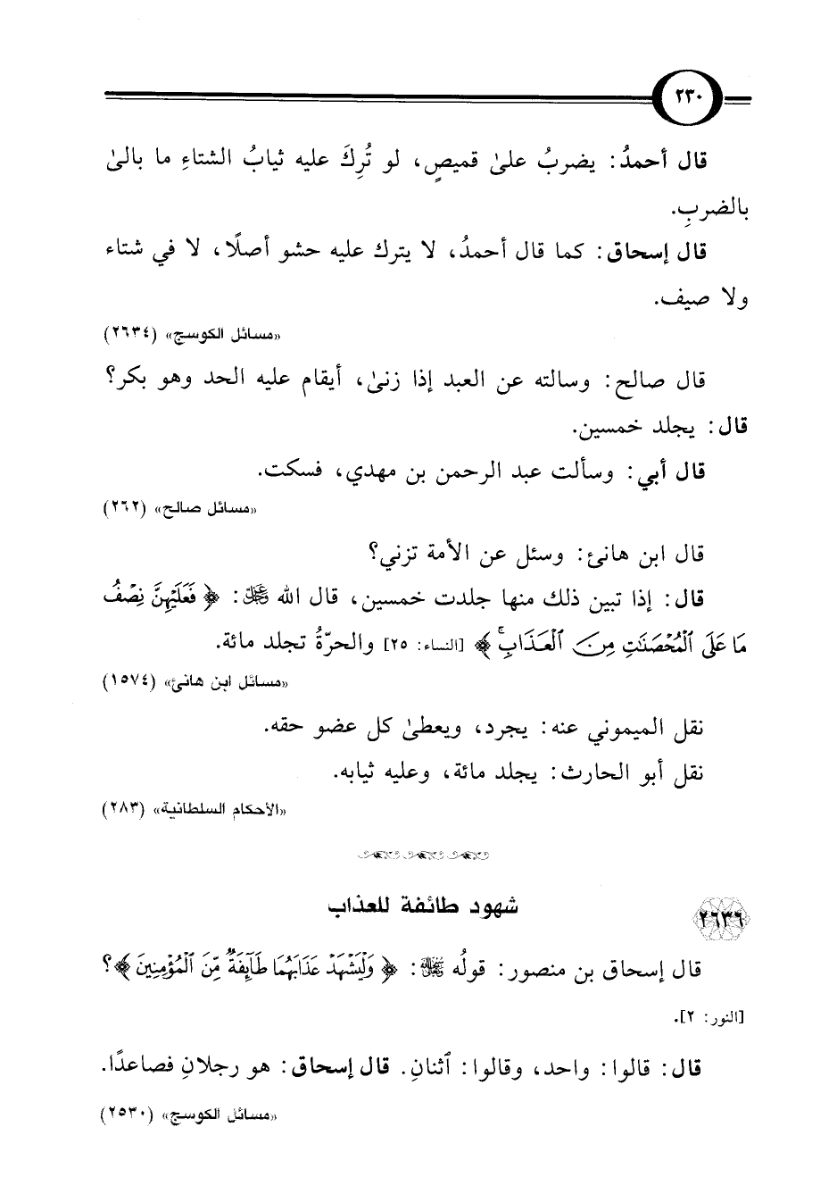 قال إسحاق بن منصور: قولُه سبحانه وتعالى: {وَلْيَشْهَدْ عَذَابَهُمَا طَائِفَةٌ مِنَ الْمُؤْمِنِينَ}؟ [النور: 2].