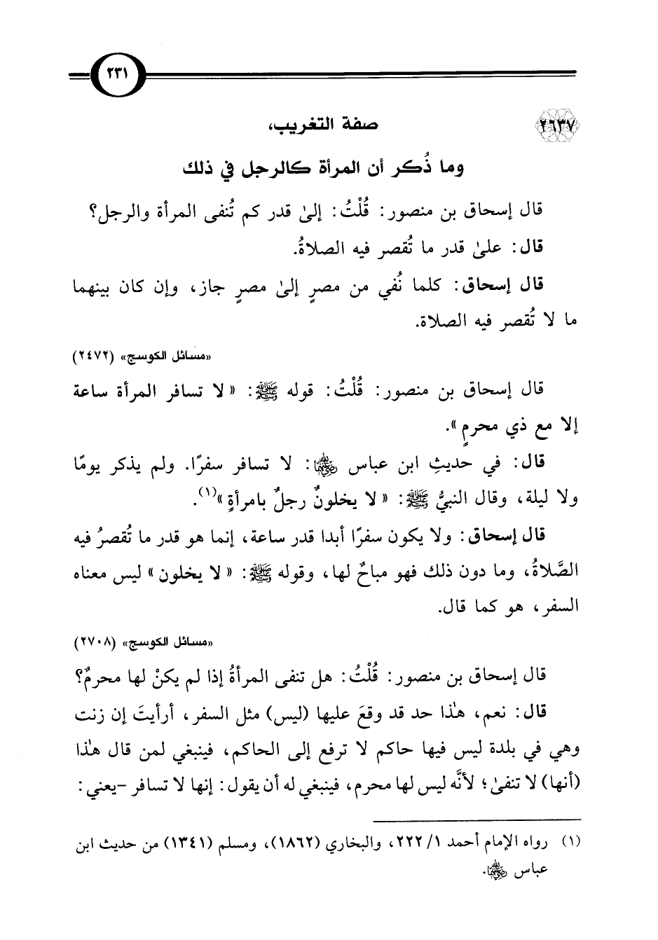 قال إسحاق بن منصور: قُلْتُ: قوله -صلى اللَّه عليه وسلم-: "لا تسافر المرأة ساعة إلا مع ذي محرمٍ".