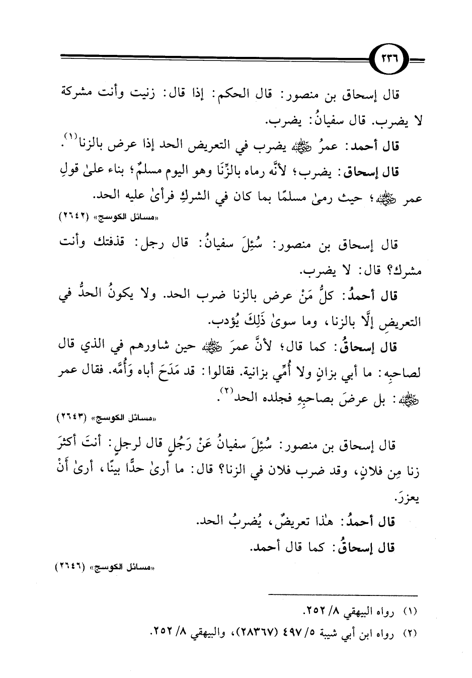 قال إسحاق بن منصور: قال الحكم: إذا قال: زنيت وأنت مشركة لا يضرب. قال سفيانُ: يضرب.