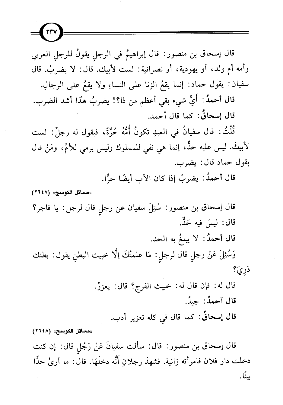 قال إسحاق بن منصور: قال إبراهيمُ في الرجلِ يقولُ للرجلِ العربي وأمه أم ولد، أو يهودية، أو نصرانية: لست لأبيك. قال: لا يضربُ. قال سفيان: يقول حماد: إنما يقعُ الزنا على النساءِ ولا يقعُ على الرجالِ.