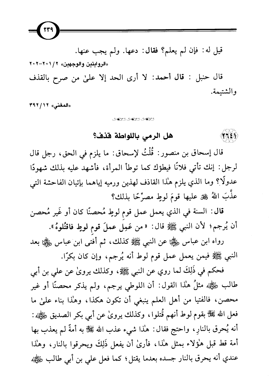 قال إسحاق بن منصور: قُلْتُ لإسحاق: ما يلزم في الحق، رجل قال لرجل: إنك تأتي فلانًا فيطؤك كما توطأ المرأة، فأشهد عليه بذلك شهودًا عدولًا؟ وما الذي يلزم هذا القاذف لهذين ورميه إياهما بإتيان الفاحشة التي عذَّبَ اللَّهُ عز وجل عليها قومَ لوطٍ مصرِّحًا بذلك؟