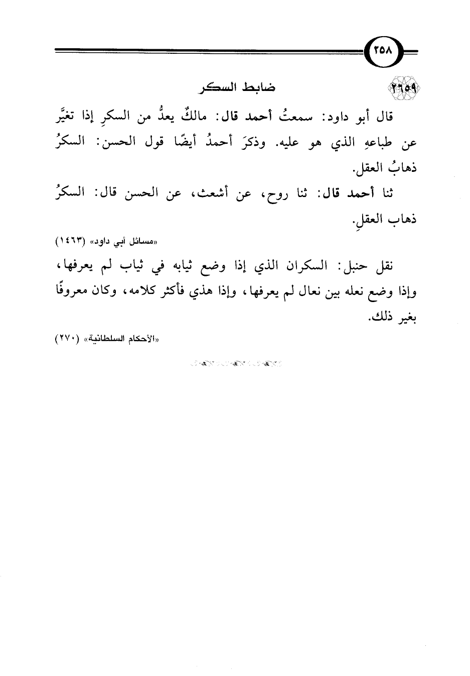 قال أبو داود: سمعتُ أحمد قال: مالكٌ يعدُّ من السكرِ إذا تغيَّر عن طباعهِ الذي هو عليه. وذكرَ أحمدُ أيضًا قول الحسن: السكرُ ذهابُ العقل.