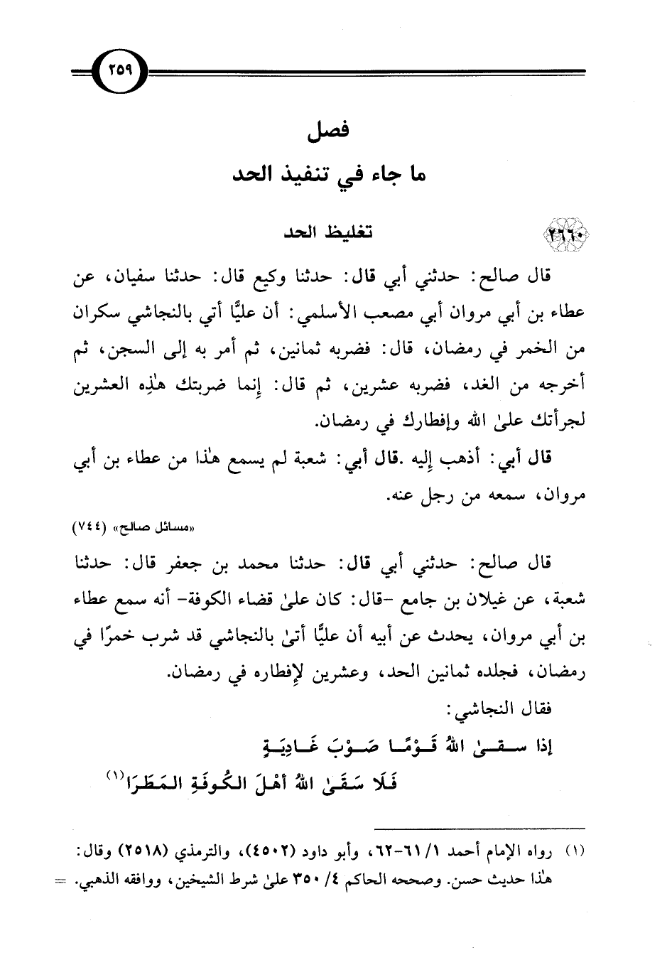 قال صالح: حدثني أبي قال: حدثنا وكيع قال: حدثنا سفيان، عن عطاء بن أبي مروان أبي مصعب الأسلمي: أن عليًّا أتي بالنجاشي سكران من الخمر في رمضان، قال: فضربه ثمانين، ثم أمر به إلى السجن، ثم أخرجه من الغد، فضربه عشرين، ثم قال: إِنما ضربتك هذِه العشرين لجرأتك على اللَّه وإفطارك في رمضان.
