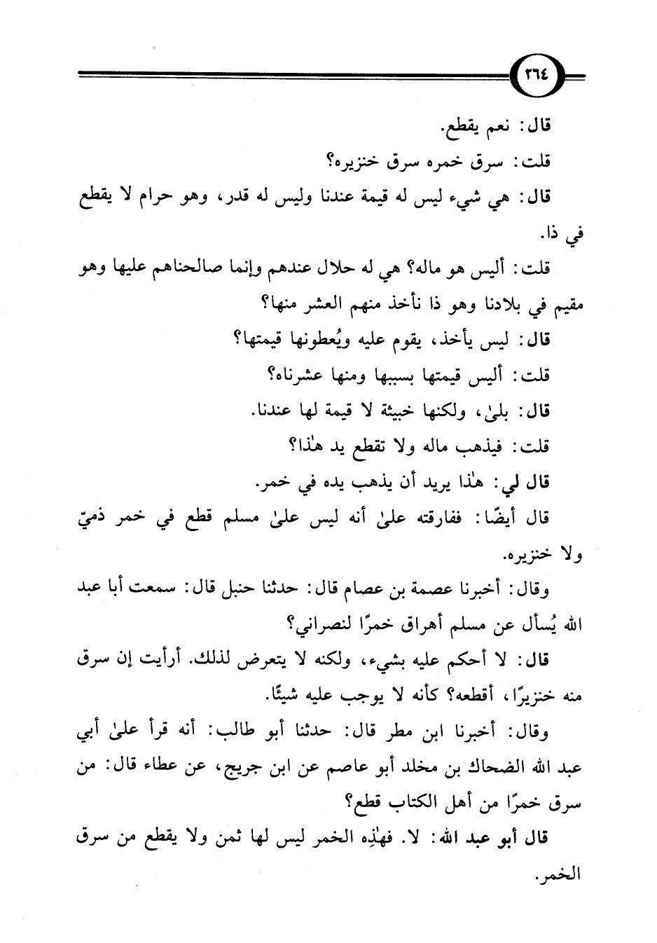 وقال: أخبرنا ابن مطر قال: حدثنا أبو طالب: أنه قرأ على أبي عبد اللَّه الضحاك بن مخلد أبو عاصم عن ابن جريج، عن عطاء قال: من سرق خمرًا من أهل الكتاب قطع؟
