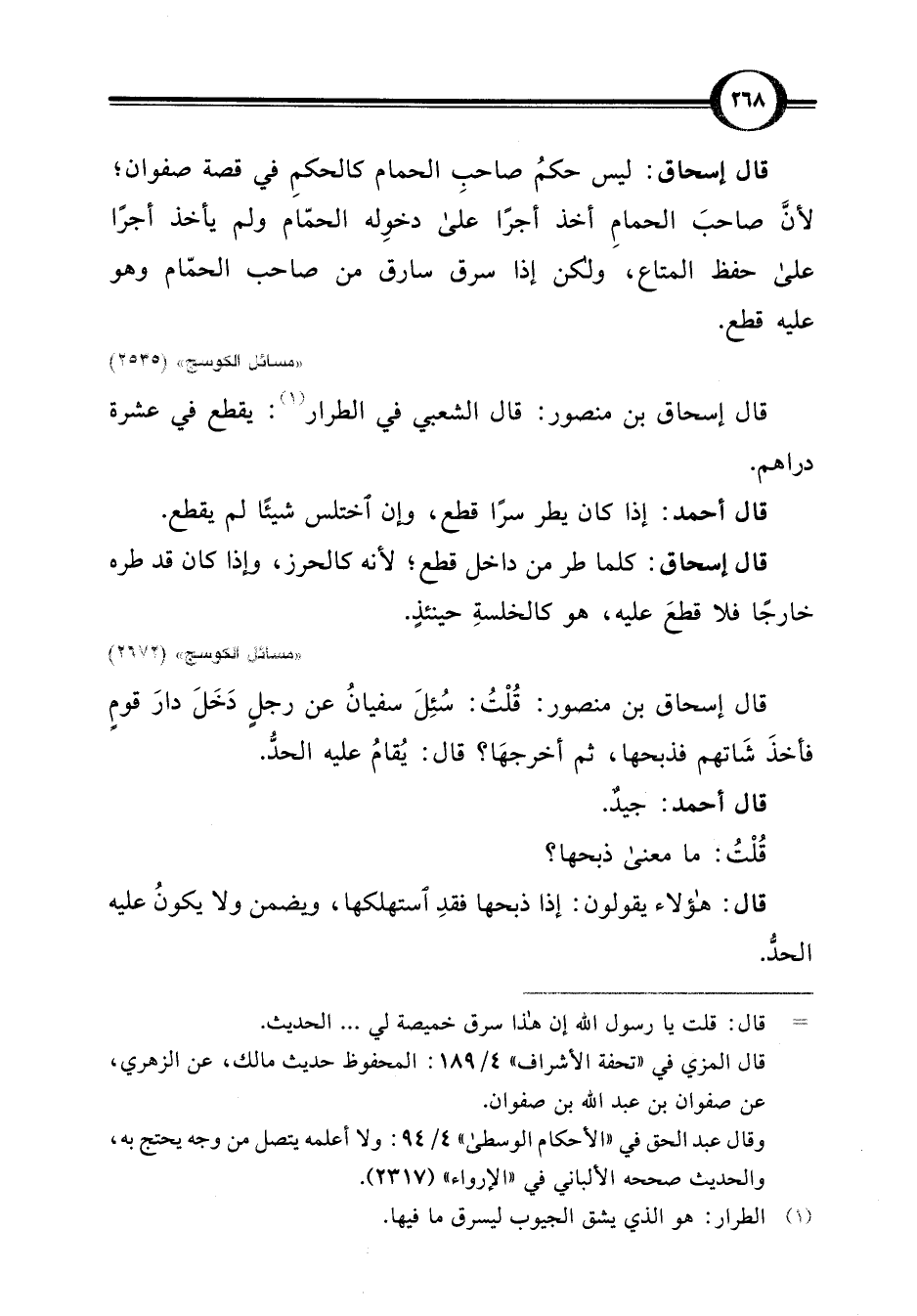 قال إسحاق بن منصور: قُلْتُ: سُئِلَ سفيانُ عن رجلٍ دَخَلَ دارَ قومٍ فأخذَ شَاتهم فذبحها، ثم أخرجهَا؟ قال: يُقامُ عليه الحدُّ.