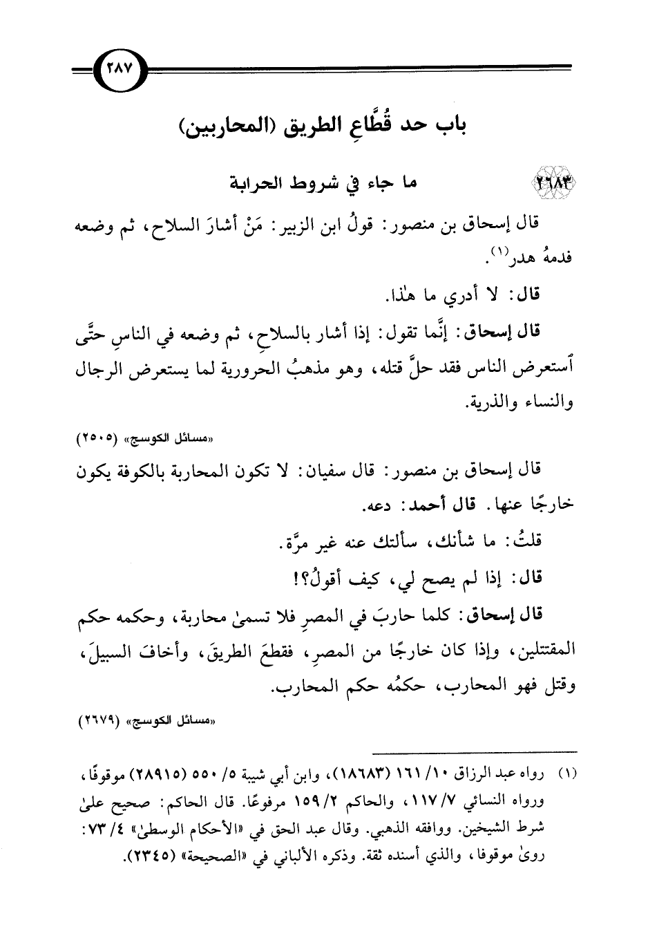 قال إسحاق: إنَّما تقول: إذا أشار بالسلاحِ، ثم وضعه في الناسِ حتَّى استعرض الناس فقد حلَّ قتله، وهو مذهبُ الحرورية لما يستعرض الرجال والنساء والذرية.
