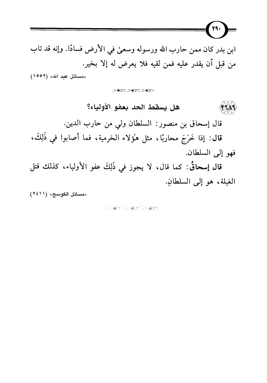 قال إسحاق بن منصور: السلطان ولي من حارب الدين.