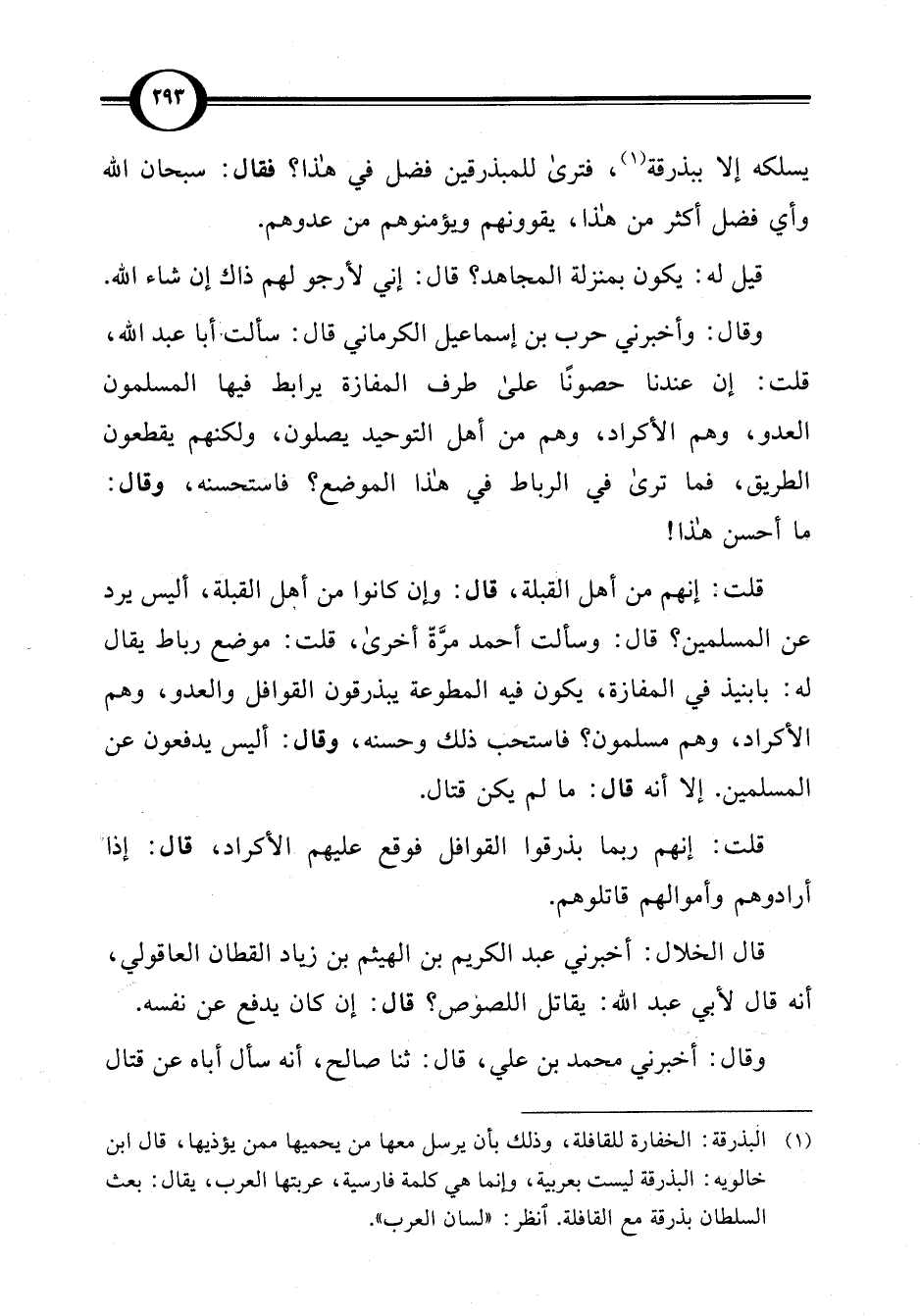 قلت: إنهم من أهل القبلة، قال: وإن كانوا من أهل القبلة، أليس يرد عن المسلمين؟ قال: وسألت أحمد مرَّة أخرى، قلت: موضع رباط يقال له: بابنيذ في المفازة، يكون فيه المطوعة يبذرقون القوافل والعدو، وهم الأكراد، وهم مسلمون؟ فاستحب ذلك وحسنه، وقال: أليس يدفعون عن المسلمين. إلا أنه قال: ما لم يكن قتال.