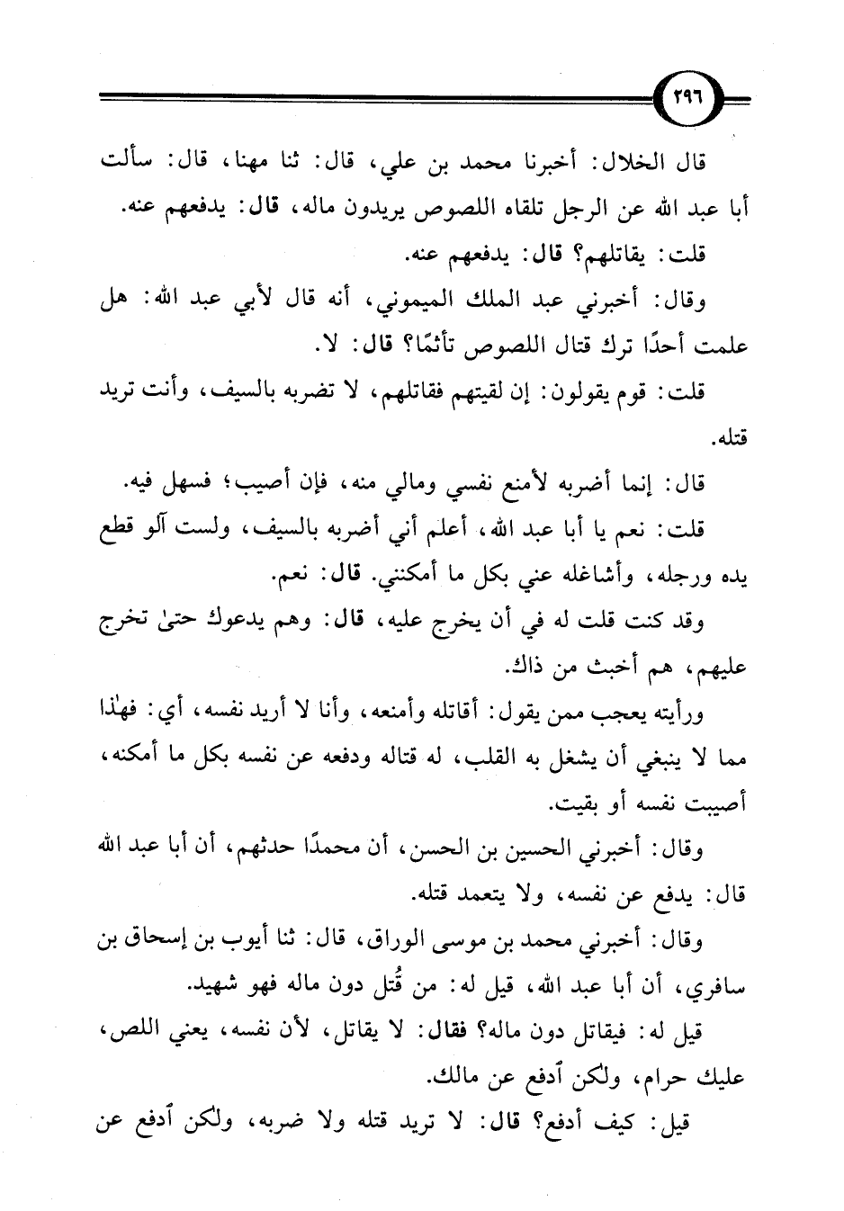 وقال: أخبرني عبد الملك الميموني، أنه قال لأبي عبد اللَّه: هل علمت أحدًا ترك قتال اللصوص تأثمًا؟ قال: لا.