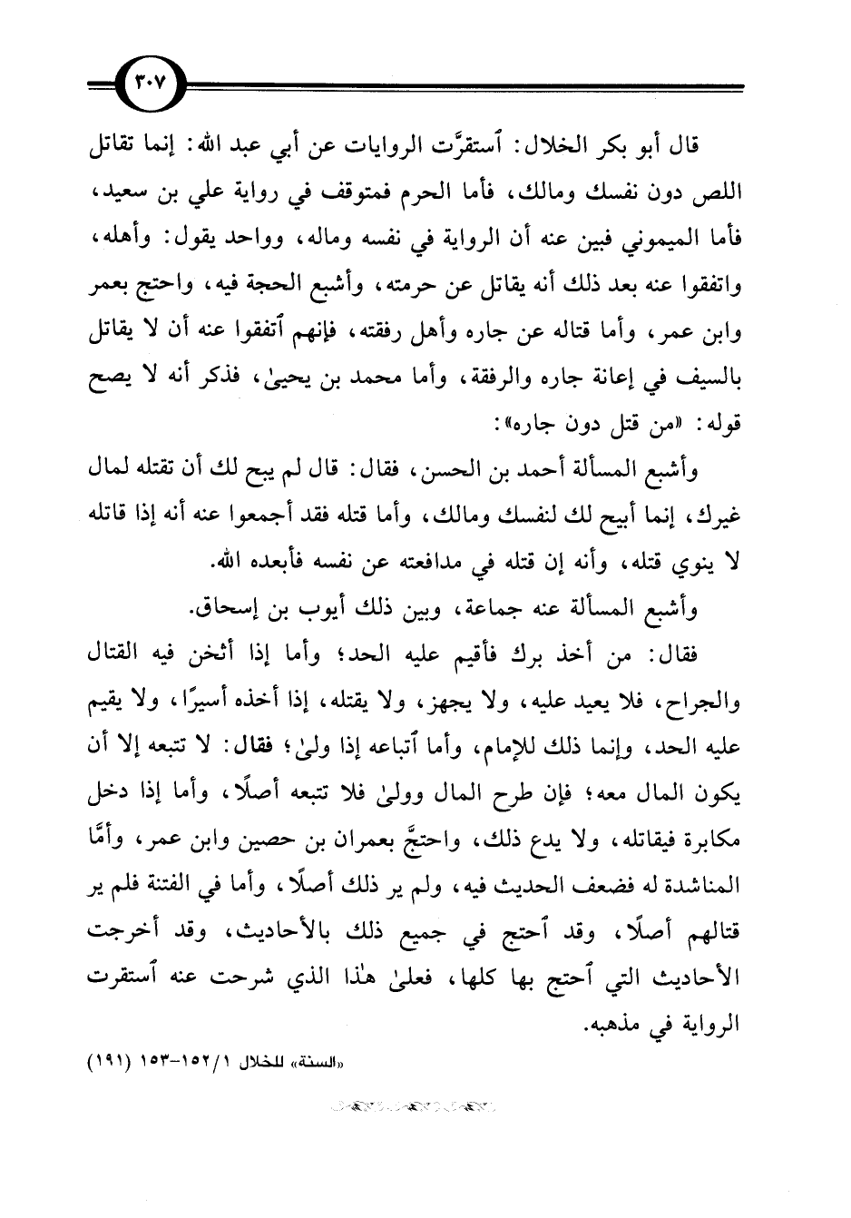 قال أبو بكر الخلال: استقرَّت الروايات عن أبي عبد اللَّه: إنما تقاتل اللص دون نفسك ومالك، فأما الحرم فمتوقف في رواية علي بن سعيد، فأما الميموني فبين عنه أن الرواية في نفسه وماله، وواحد يقول: وأهله، واتفقوا عنه بعد ذلك أنه يقاتل عن حرمته، وأشبع الحجة فيه، واحتج بعمر وابن عمر، وأما قتاله عن جاره وأهل رفقته، فإنهم اتفقوا عنه أن لا يقاتل بالسيف في إعانة جاره والرفقة، وأما محمد بن يحيى، فذكر أنه لا يصح قوله: "من قتل دون جاره".