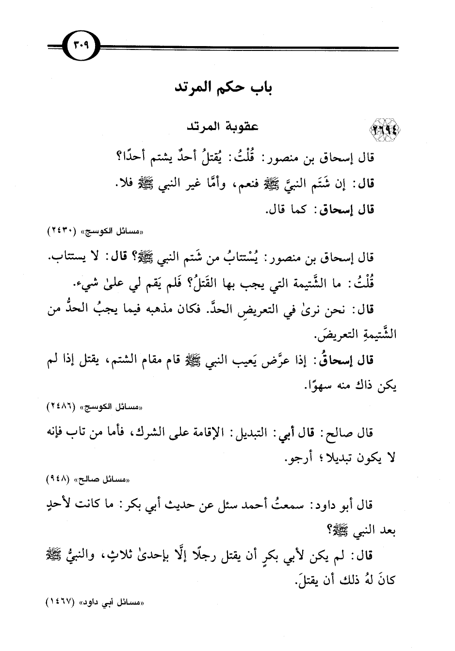 قال إسحاق بن منصور: يُسْتتابُ من شَتم النبي -صلى اللَّه عليه وسلم-؟ قال: لا يستتاب.