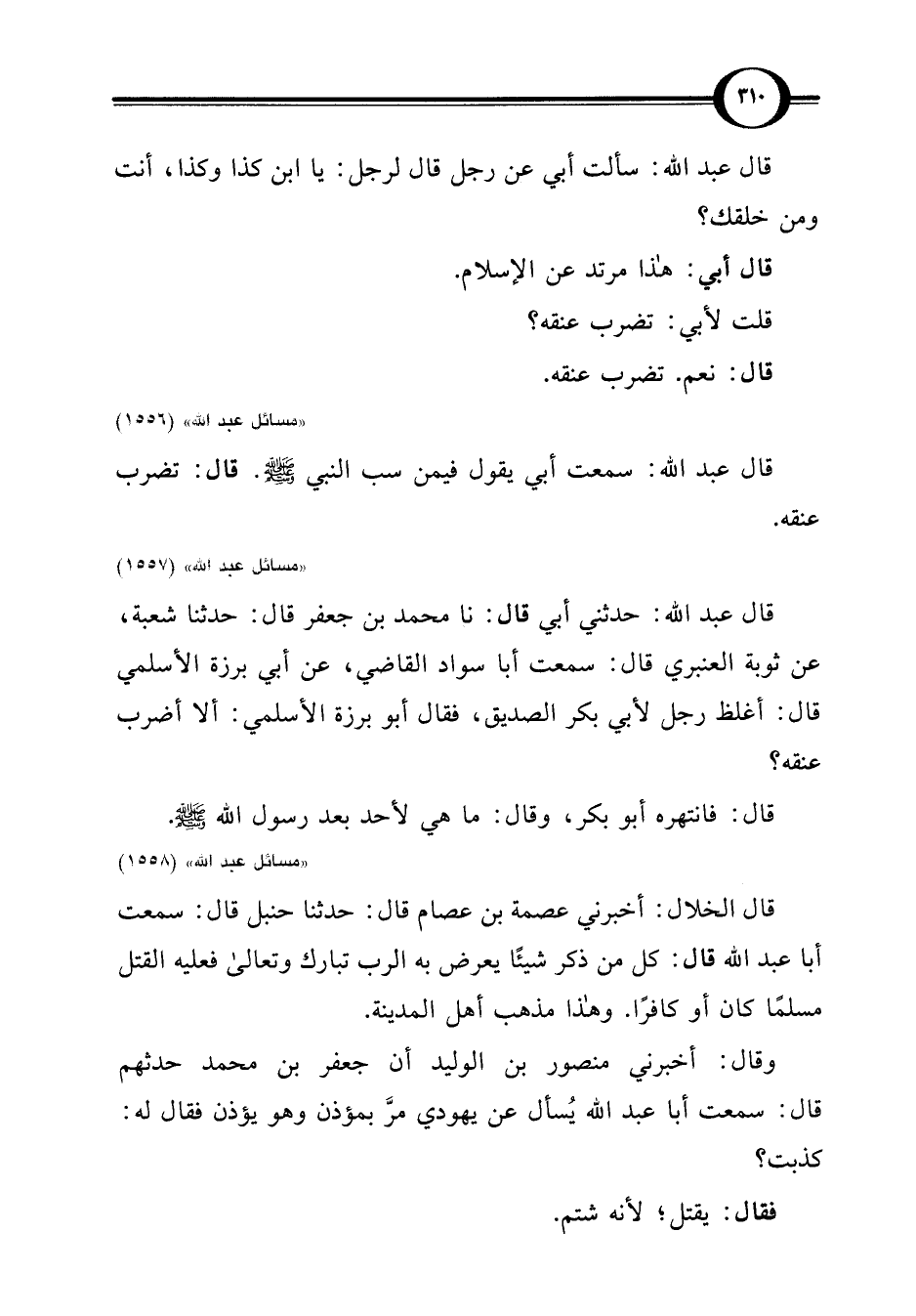 قال عبد اللَّه: سمعت أبي يقول فيمن سب النبي -صلى اللَّه عليه وسلم-. قال: تضرب عنقه.