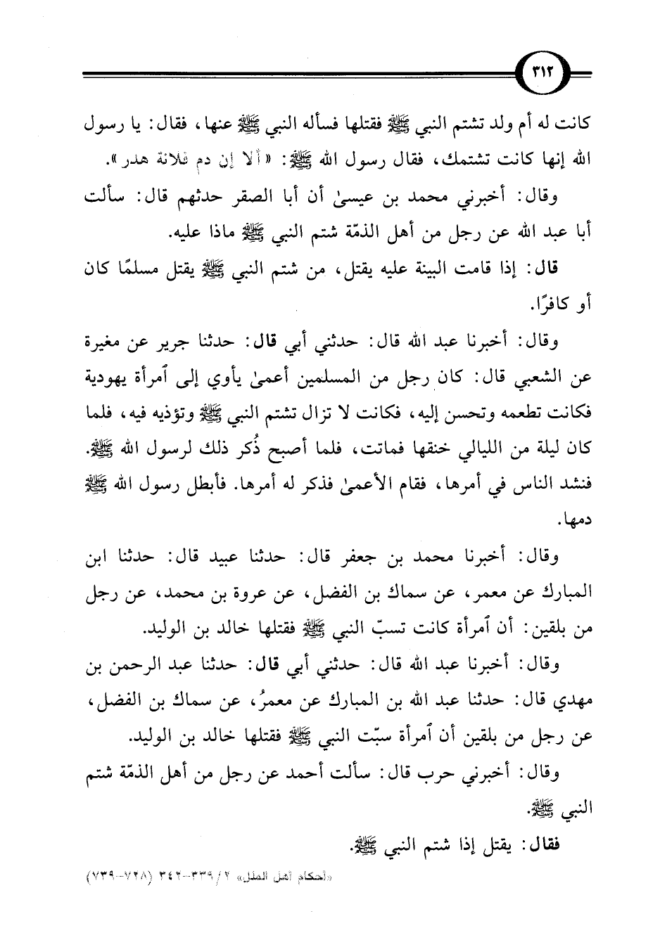وقال: أخبرنا عبد اللَّه قال: حدثني أبي قال: حدثنا جرير عن مغيرة عن الشعبي قال: كان رجل من المسلمين أعمى يأوي إلى امرأة يهودية فكانت تطعمه وتحسن إليه، فكانت لا تزال تشتم النبي -صلى اللَّه عليه وسلم- وتؤذيه فيه، فلما كان ليلة من الليالي خنقها فماتت، فلما أصبح ذُكر ذلك لرسول اللَّه -صلى اللَّه عليه وسلم-. فنشد الناس في أمرها، فقام الأعمى فذكر له أمرها. فأبطل رسول اللَّه -صلى اللَّه عليه وسلم- دمها.