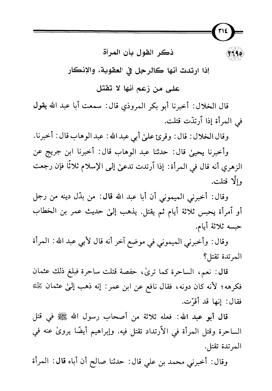 2695 - ذكر القول بأن المرأة إذا ارتدت أنها كالرجل في العقوبة، والإنكار على من زعم أنها لا تقتل
